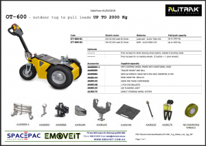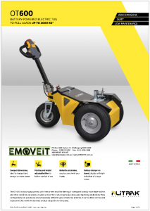 The OT-600 is a Outdoor three wheeled ZERO emission electric drive pedestrian vehicle ergonomically designed to easily move Light planes, trailers, caravans, wagons and single commercial or multiple residential waste containers with safety and ease. The Tug Trak reduces the manual effort required to perform repetitive tasks thereby improving productivity and reducing the chance of work related injuries. The OT-600 has a pulling capacity of 2000kgs and a loading capacity of 300kgs and can handle 250kgs loads on a 20% slope.