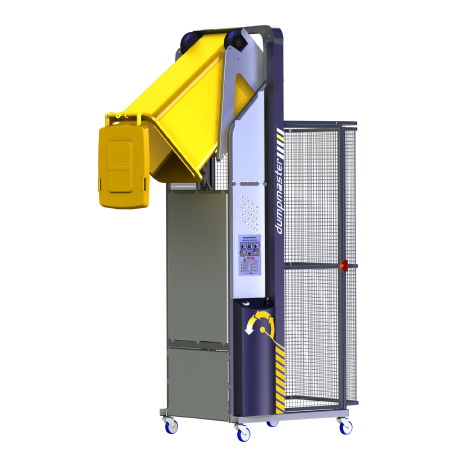 Dumpmaster bin tippers are very versatile and are used in dozens of applications; from emptying rubbish bins into skips to pouring food ingredients into mixers. They feature a unique tipping action which lifts the bin straight up, then gently rolls it upside down over the lip of the receptacle. Less than 1m3 of floor space is required regardless of tipping height, since the weight of the bin is maintained within the floor footprint at all times.