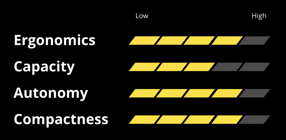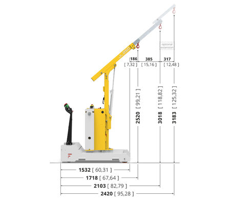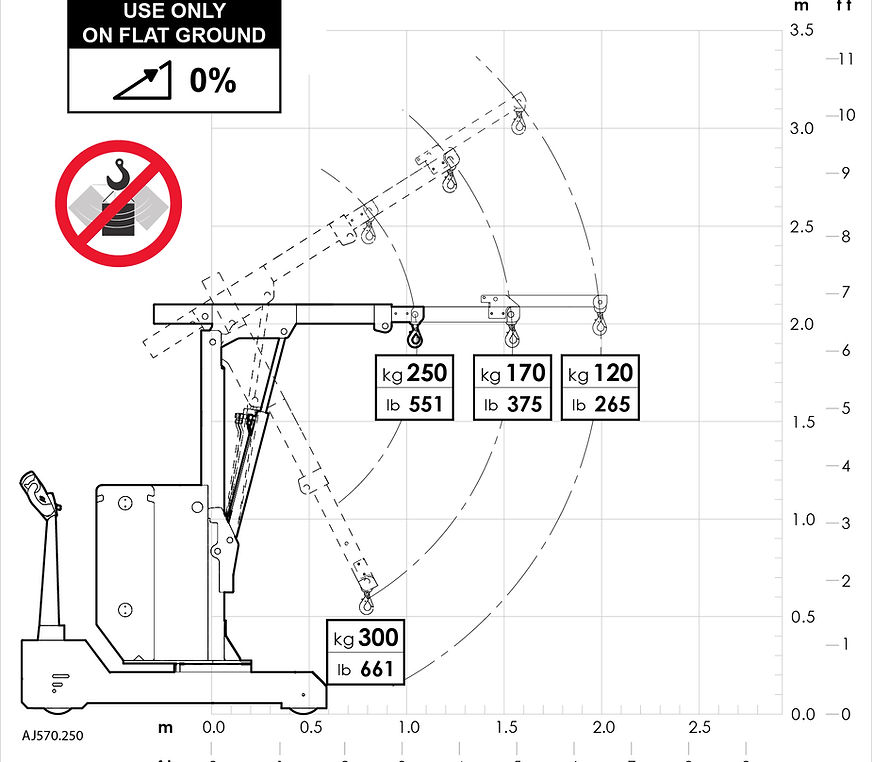 The Just Lift JL250 counterweight crane has a capacity of 250 kg in the first step, 160 kg in the second step and 130 kg in the third (the third step is an additional extension to be added manually).