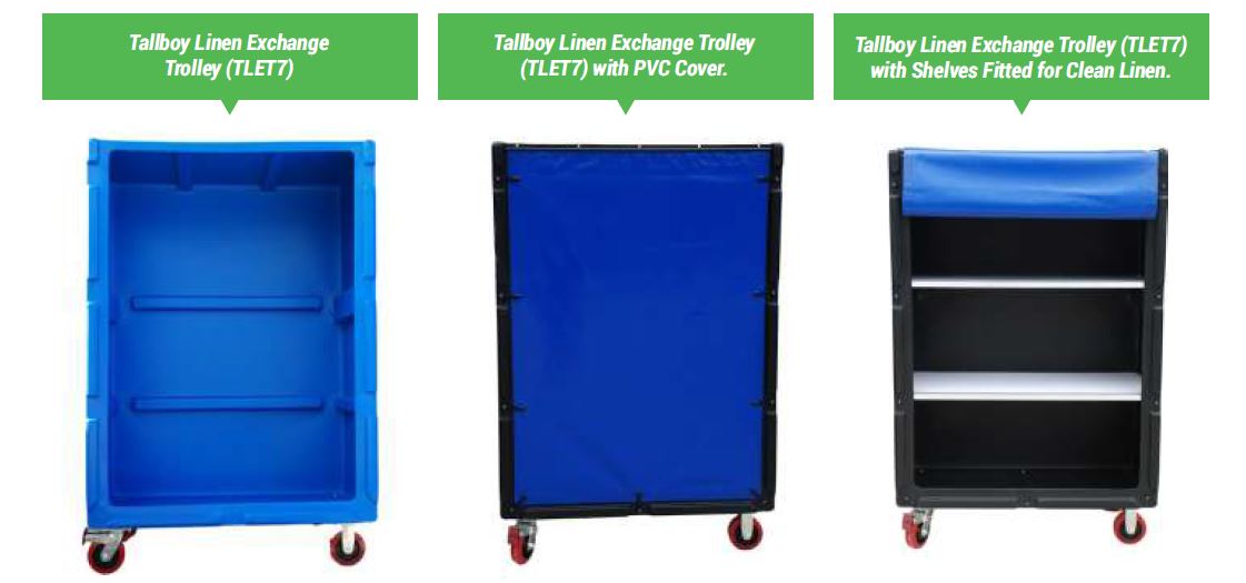 Many customers including Private and Public Linen Service Companies, and Government Departments are proving the benefits of the expanding our Tallboy Linen Exchange Trolley range over existing wire mesh designs: